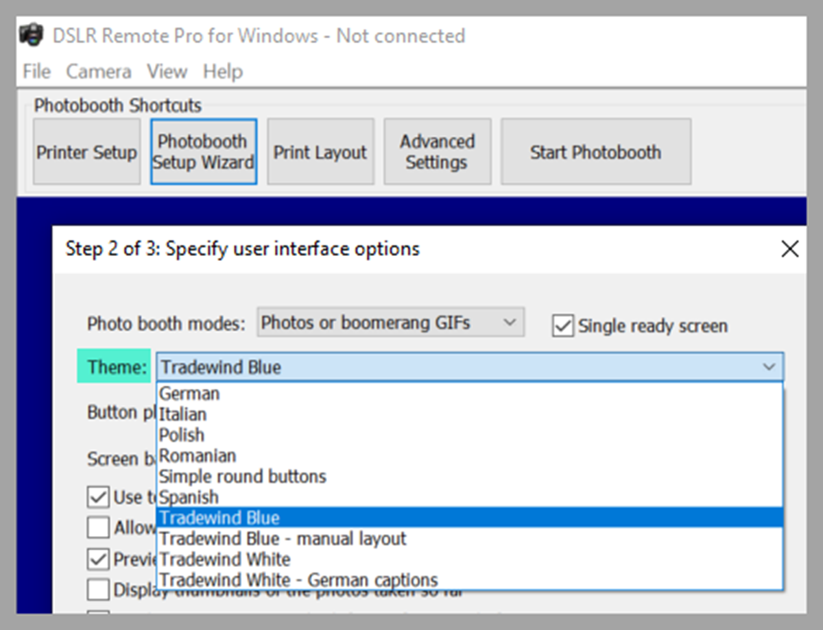 Checkboxes in the Photobooth Setup Wizard Step 2 DSLR Remote Pro 3.16